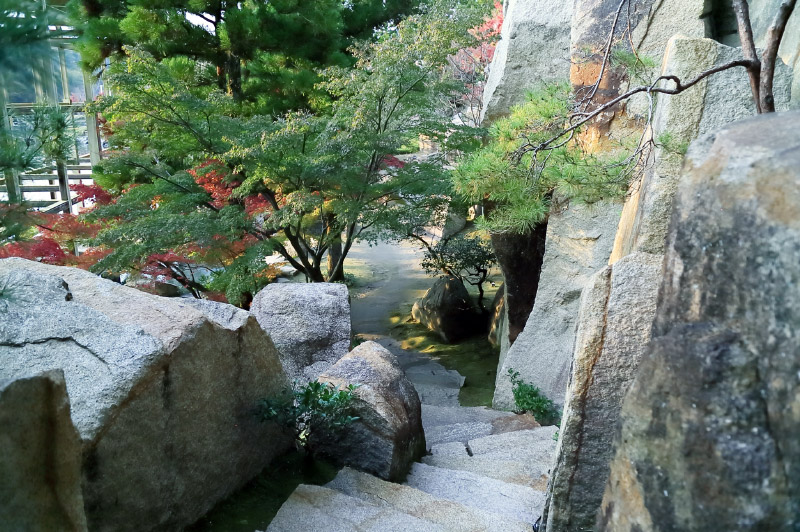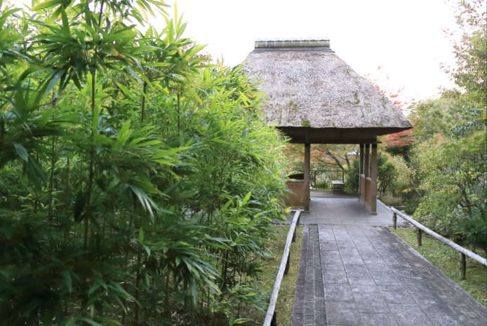 巨石群を抜けると、趣ある紅葉の庭園が迎えてくれます。若葉の頃、そして、燃えるような紅葉の秋に再び訪れるのが楽しみです。橋の終点はギャラリーや相楽木綿伝承館がある観月楼。休憩スペースもあり、ほっとひと息。これからの森歩きに備えましょう!