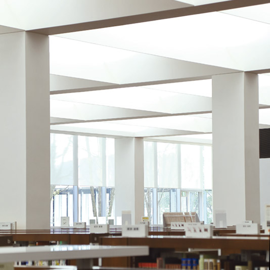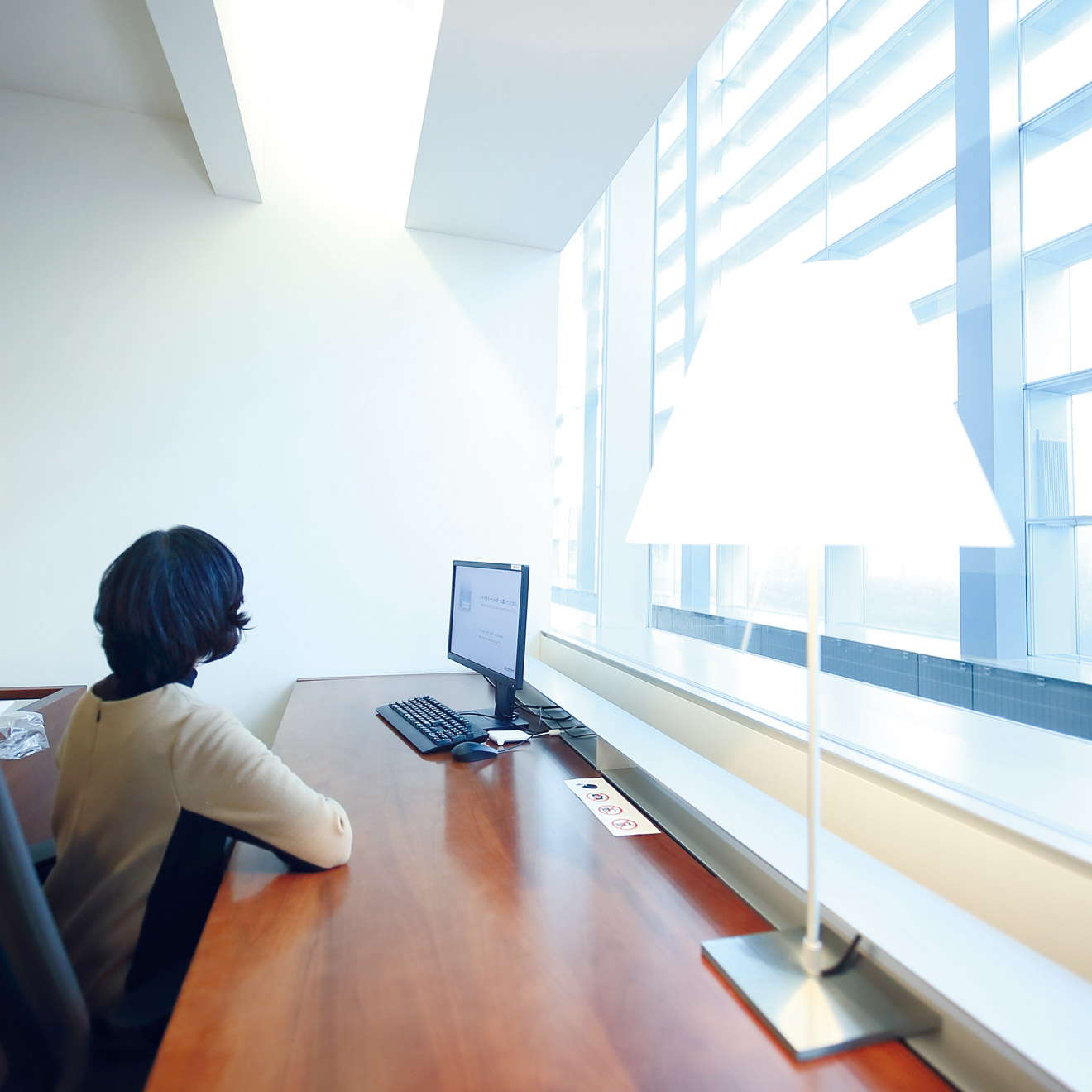 中庭を望むチェアで、SFの世界に迷い込んだようなガラス壁のスタイリッシュな空間で、屋上庭園に面した開放感あふれるカフェテリアで。巨大な知の森には、思いのままに時間を過ごせる場所がたくさん。