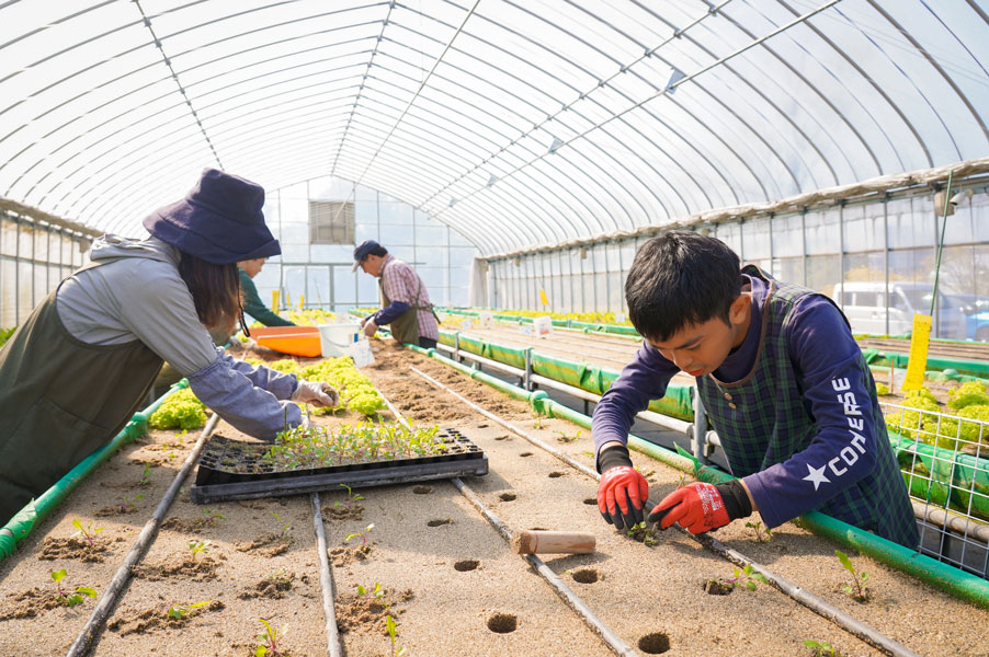 最後にもうひとつ、トレファームラボの魅力をお伝えします。それは、精華町だけではなく全国から人が集まる場所であるということです。トレファームラボでは精華町をはじめとした地元の人たちがスタッフとして働いています。それ以外にもたくさんの人たちが訪れます。京都橘大学や南山城支援学校の生徒さんは演習や校外活動の一環としてトレファームラボで野菜を育てています。トレファーム®の活用を検討する人たちも全国から見学に訪れます。