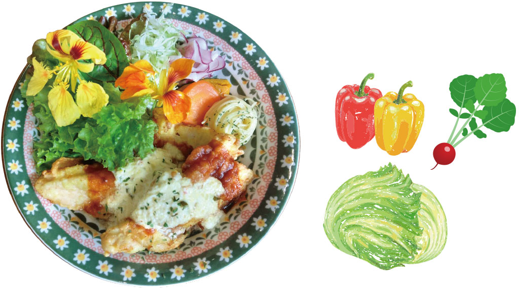 cafeここらく、COCONIでは、トレファームラボの野菜を使ったサラダやお惣菜を食べることができます。