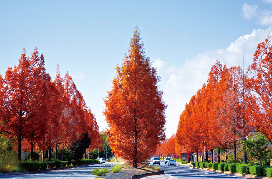 精華大通のメタセコイア並木は、こんなに素晴らしく紅葉しました。三列に渡る沢山のメタセコイアの木々は、樹形が美しく見応えがあります。令和6年の秋、お見逃しなく。