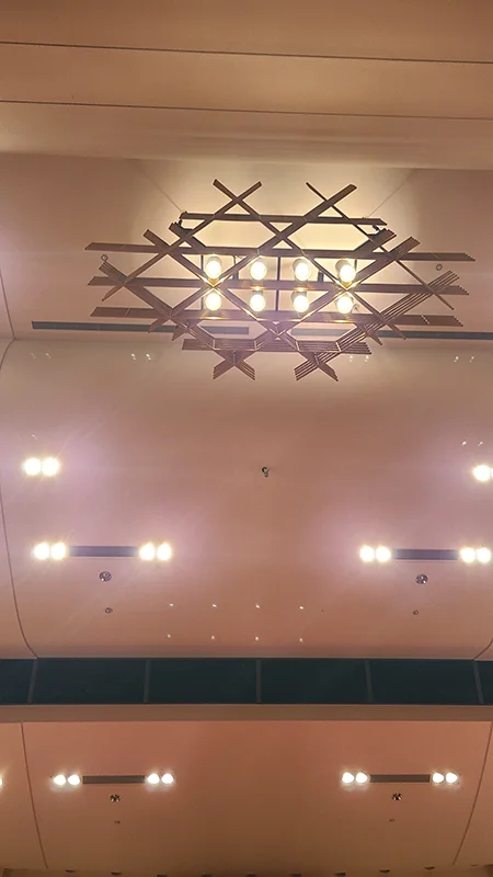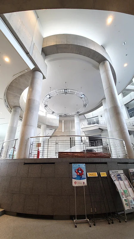 エントランスホールの上を見上げると、まるで宇宙船のような空間が広がるアトリウム。まるで舞台装置のようです。照明器具の掃除は大変みたいです(笑)