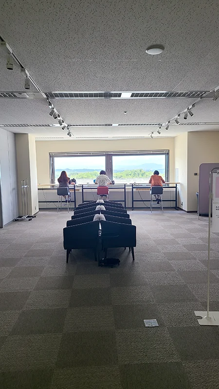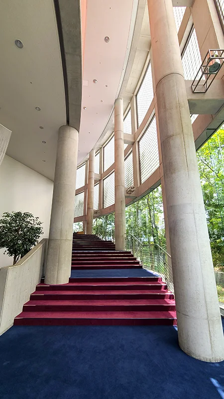 1,000人規模で収容できる音響性能の優れたコンサートホールのホワイエに出ると緩やかな曲線の窓、階段、柱等、外の緑が目に飛び込んできて、とてもワクワクする空間です。