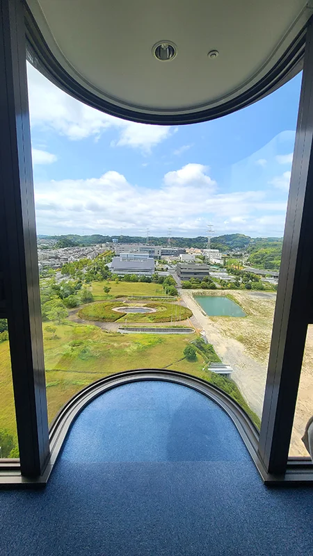 高い建物にあるラボ棟。空調設備やダクト類が表には全く出ていなかったのでホテルと思い込んでいたんですが、実は建物中央の吹き抜け空間にまとめることで綺麗な外観を可能としています。ここは起業家や、理化学実験を行っている企業等、様々な企業活動の後押しをしておられます。未来は明るいですね!一般の方は入れませんが、高層階から見渡した景色が最高でしたよ。