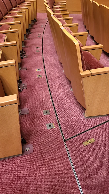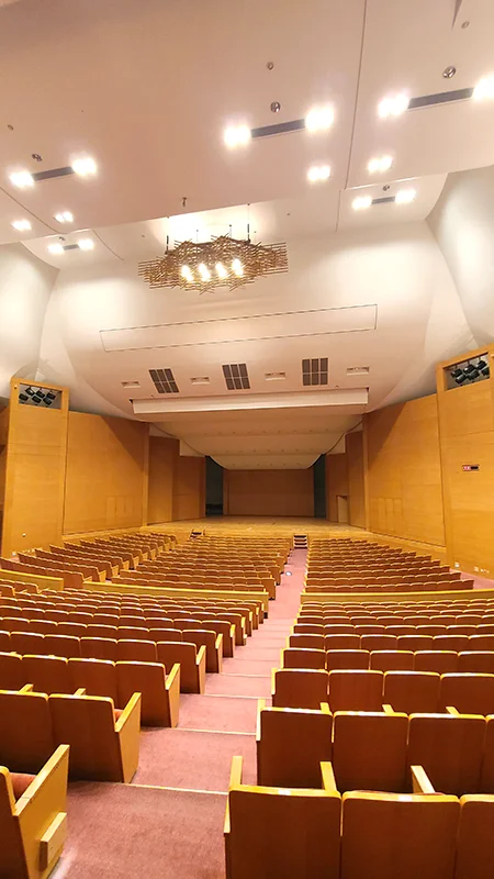 ホールは音響評価が高いようで、コンサート用のピアノも2台あり、全国の学生や音楽家に好評とのこと。ホテルが併設され、音楽の練習合宿が出来るのも魅力のようです。前席が可動式でオーケストラピットも設置可能、舞台内容によっては、花道も設置したり、隠したり変幻自在なホールとなっています。舞台には一部に昇降装置も備えているようです。照明は設立当時「住友ホール」だったことの名残で井桁になっています。