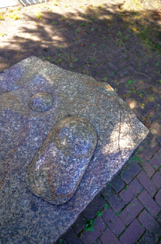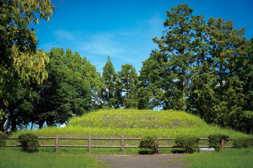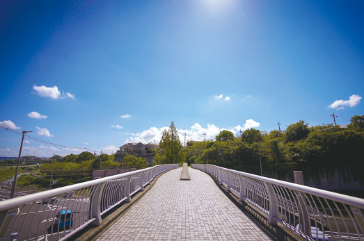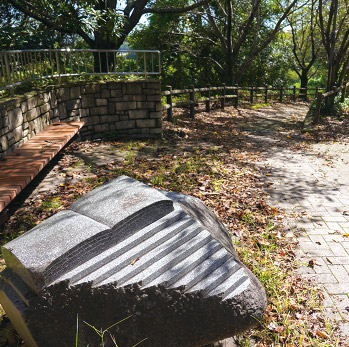 古墳のオブジェ 住宅街北側の山田川沿いの遊歩道は、小学生のマラソンコースにもなる道、その先に広がる田園風景、遠くの山や空に癒されます。背の高いメタセコイアが街角のアクセント。古墳や本等をかたどったオブジェがあり想像力を掻き立てます。