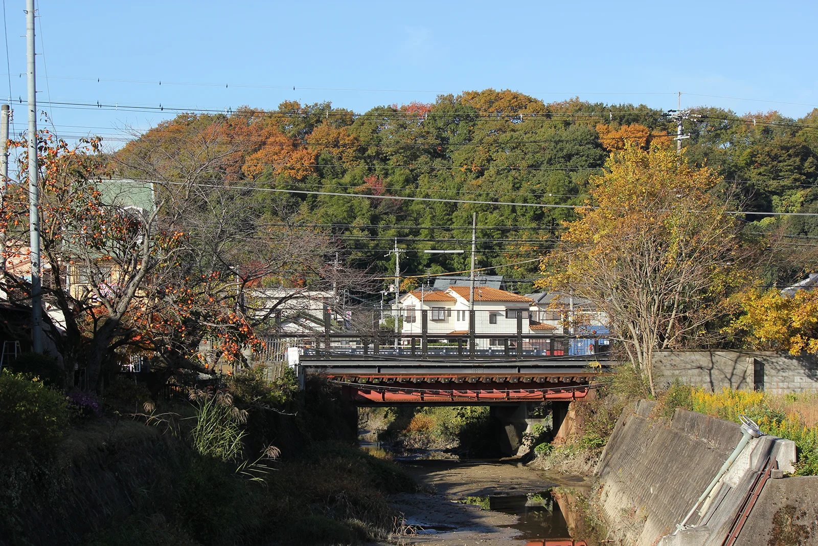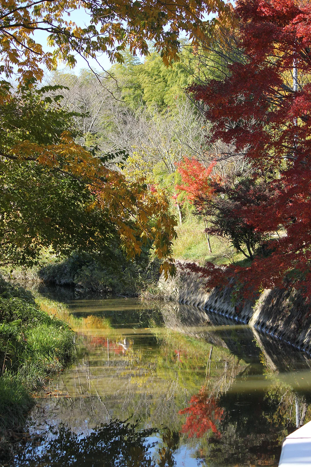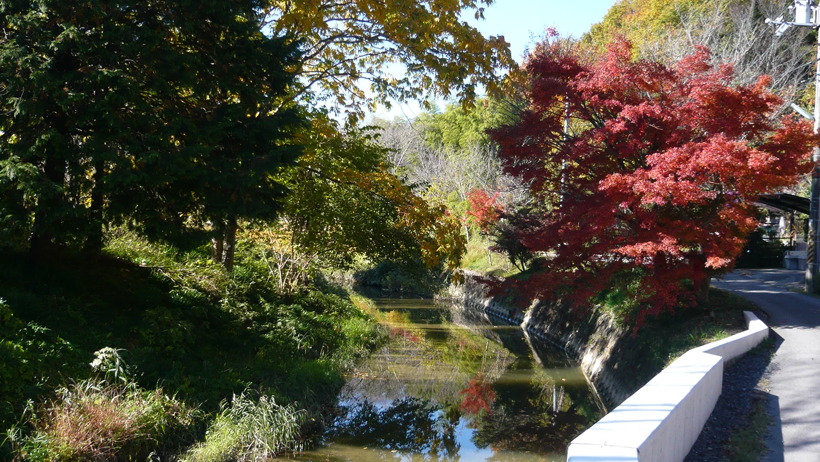 川沿い北側の道が紅葉を楽しめるところです。堤防の草むらも気にかけて歩いてください。この時はイタチと出合いました。