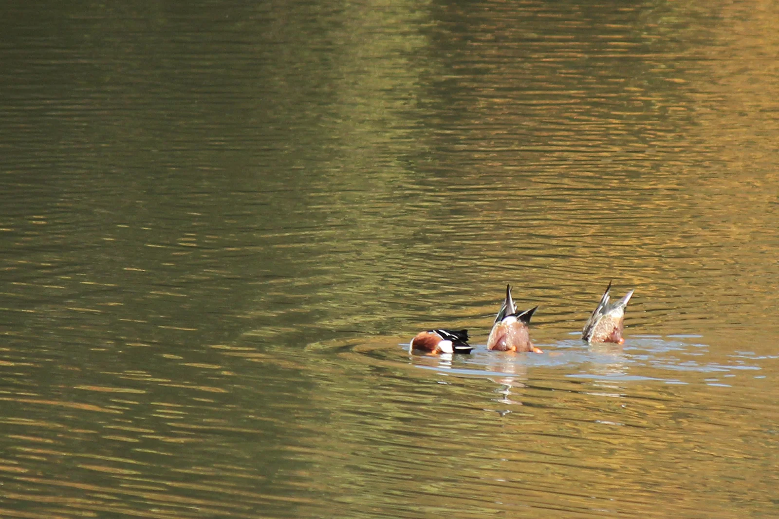 水面が水鏡となり黄金色に染まったところにマガモ・ホシハジロ・カイツブリなどの水鳥も集まり始めていました。