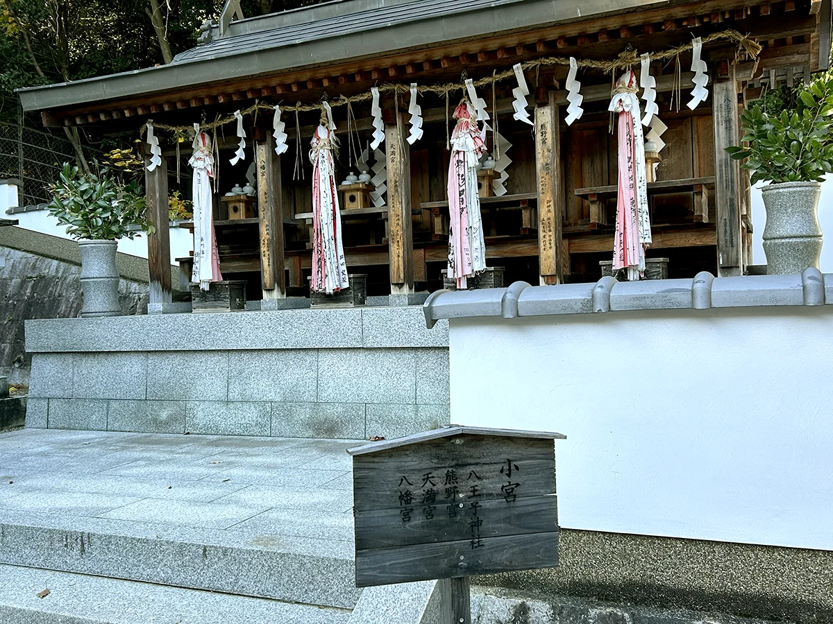 こちらに祀られている神様は一柱だけではありません。小宮の熊野宮の御祭神は伊邪那美命(イザナミノミコト)。天満宮の御祭神は菅原道真公。八幡宮の御祭神は応神天皇です。