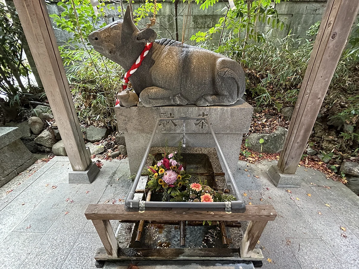 境内の手水舎には、季節の花を浮かべた花手水が設えられ、参拝者の目を楽しませてくれます。そばには神牛が祀られており、農耕や五穀豊穣との関わりを感じさせます。