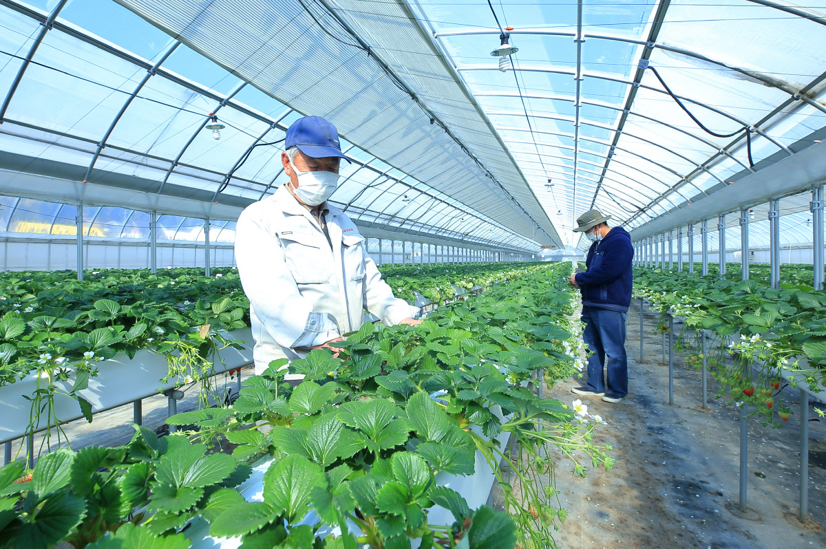 精華町のいちごには、作り手たちの手間暇と愛情がつまっています。広いハウスでは果実が次々と熟し、あなたの手で摘まれるときを待っています。