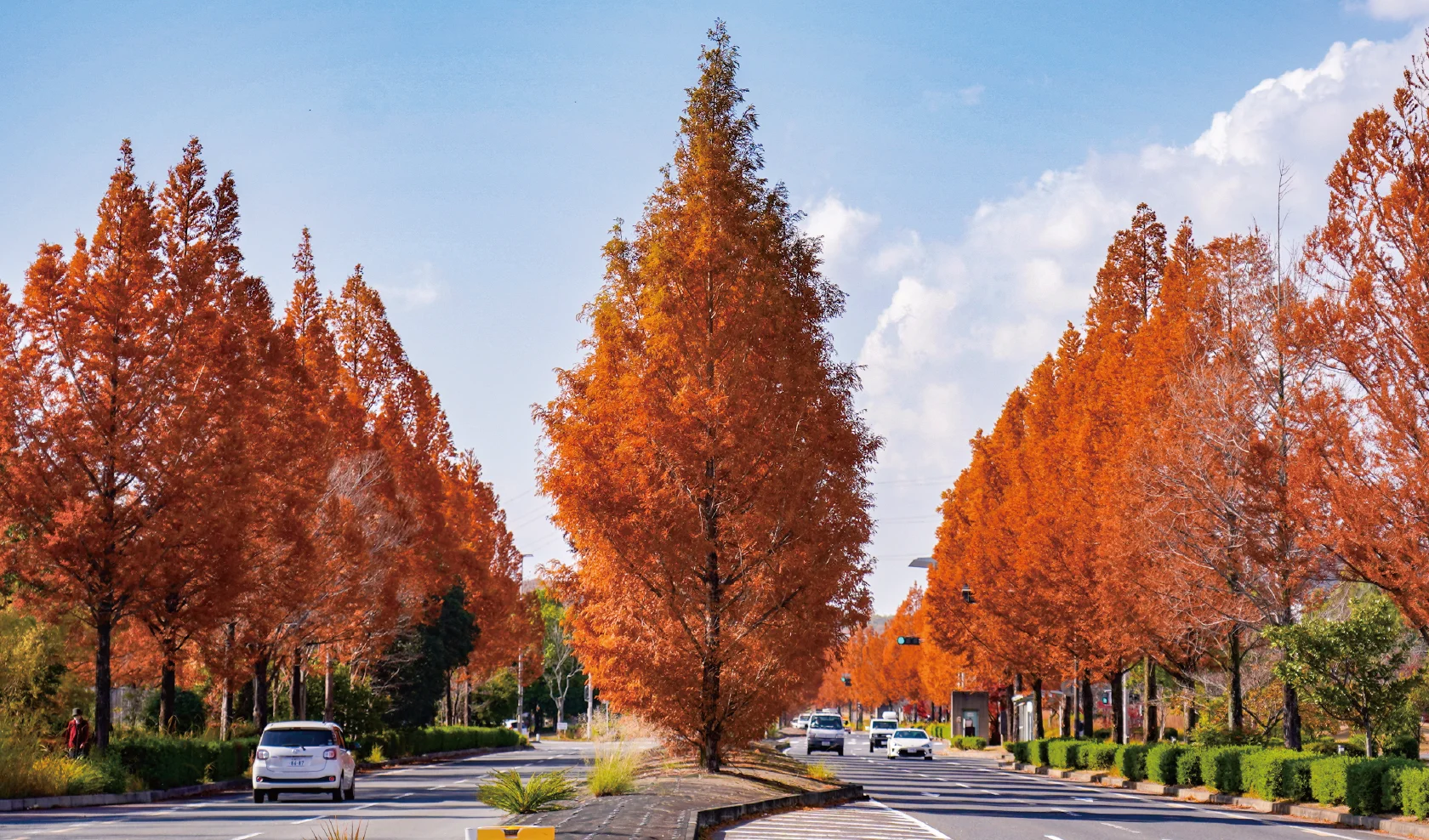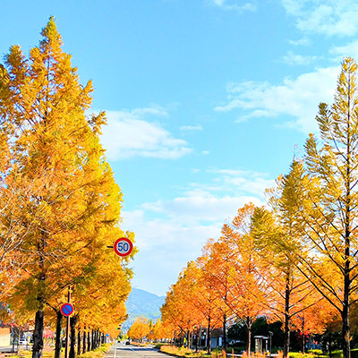 精華町の秋の象徴といえば「都市景観100選」にも選ばれた精華大通りのメタセコイア並木道。並木道の端に位置するけいはんなプラザのアートな日時計レーザー光線が、秋の夜空に放たれています。