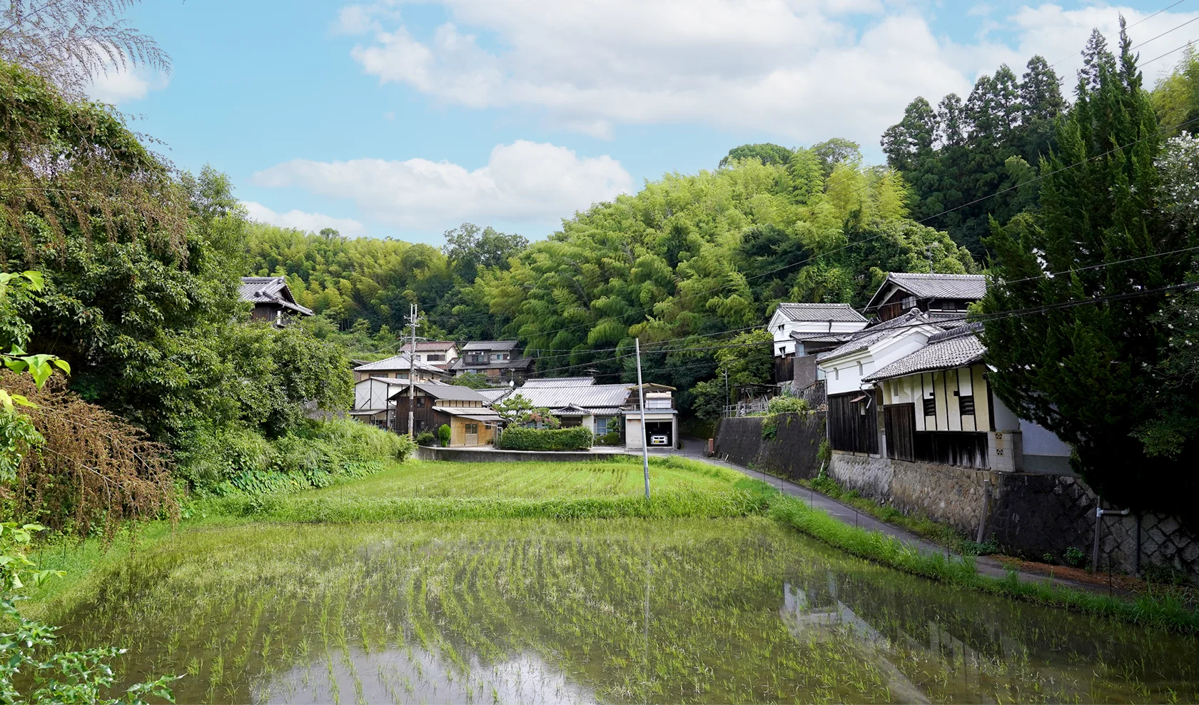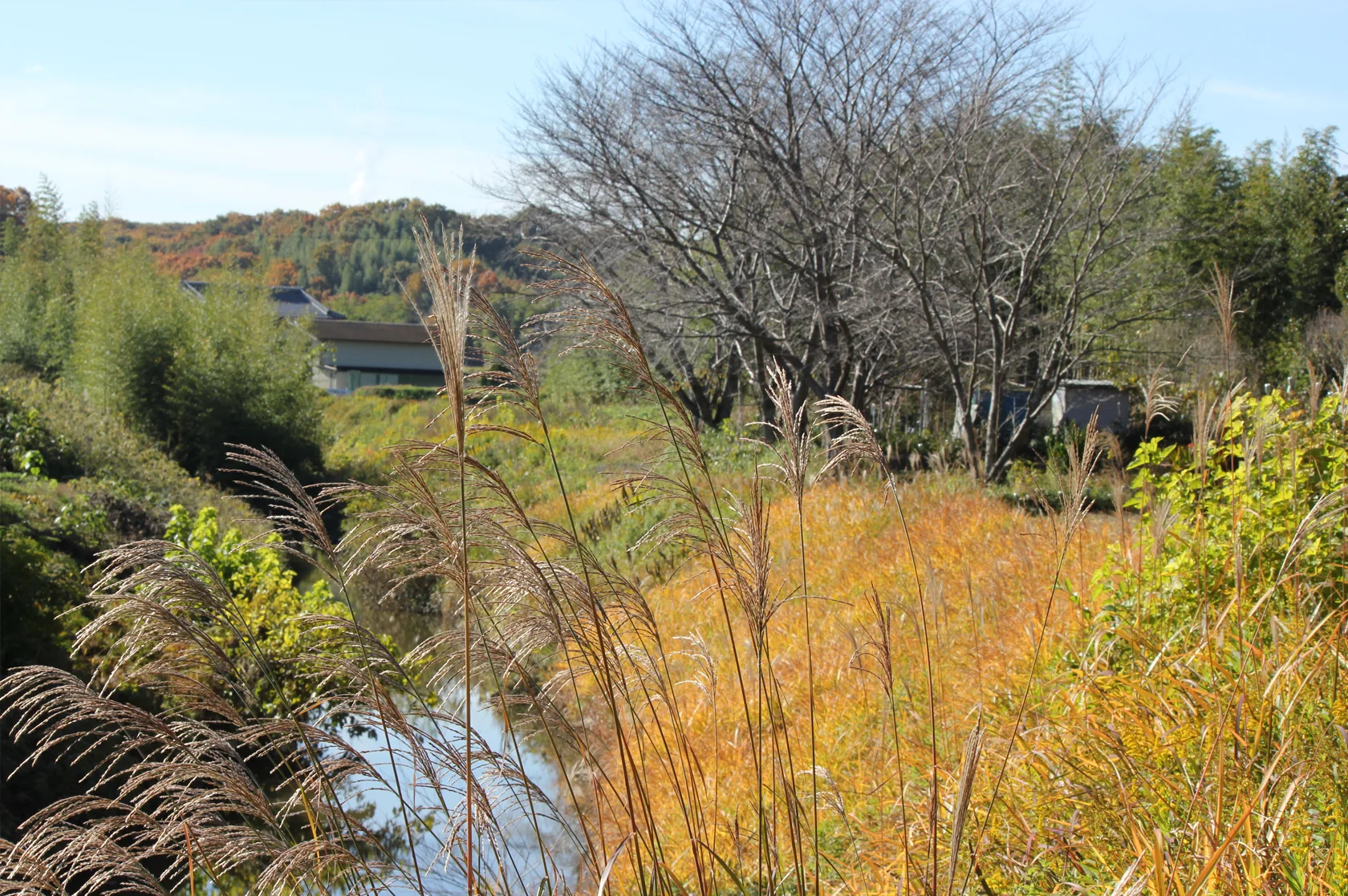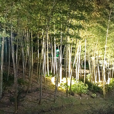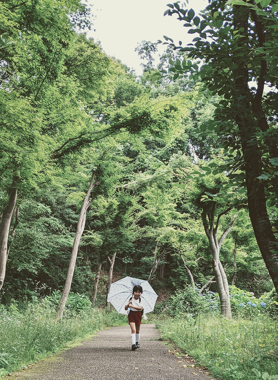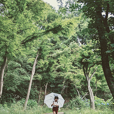 人々が憩う広場から、谷あいの小川沿いに梅林を経て竹林の小径へ。こどもたちの歓声もやがて遠く、樹々の葉擦れと鳥の声が森へと誘います。