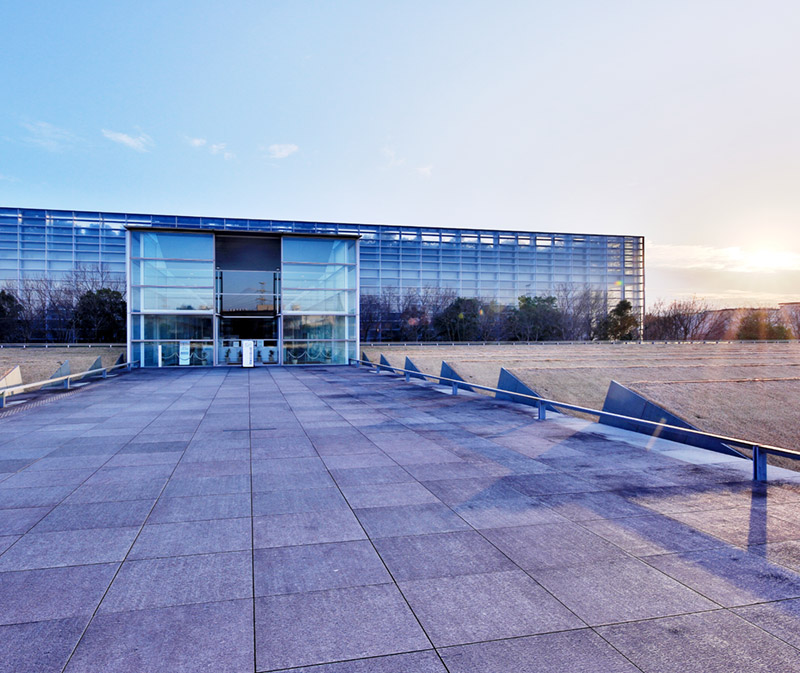青空に映える巨大なガラスの直方体。芝生の大地が目を引く、けいはんな地域のランドマーク。国立国会図書館関西館です。