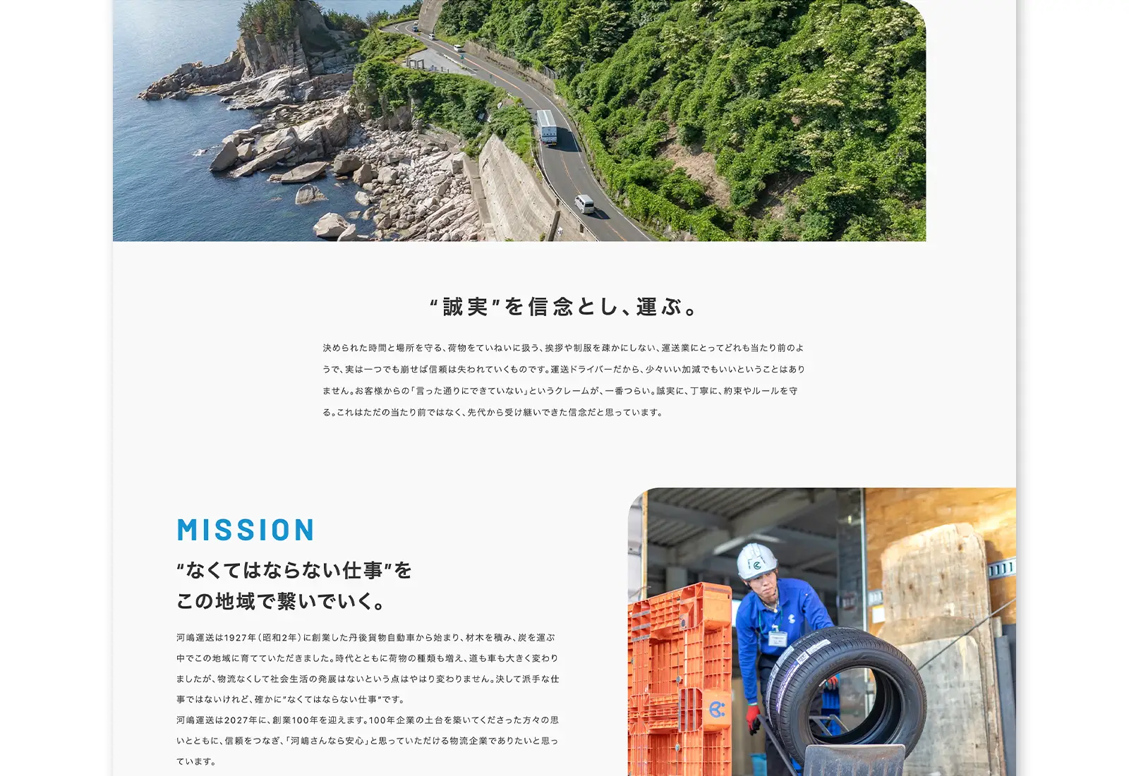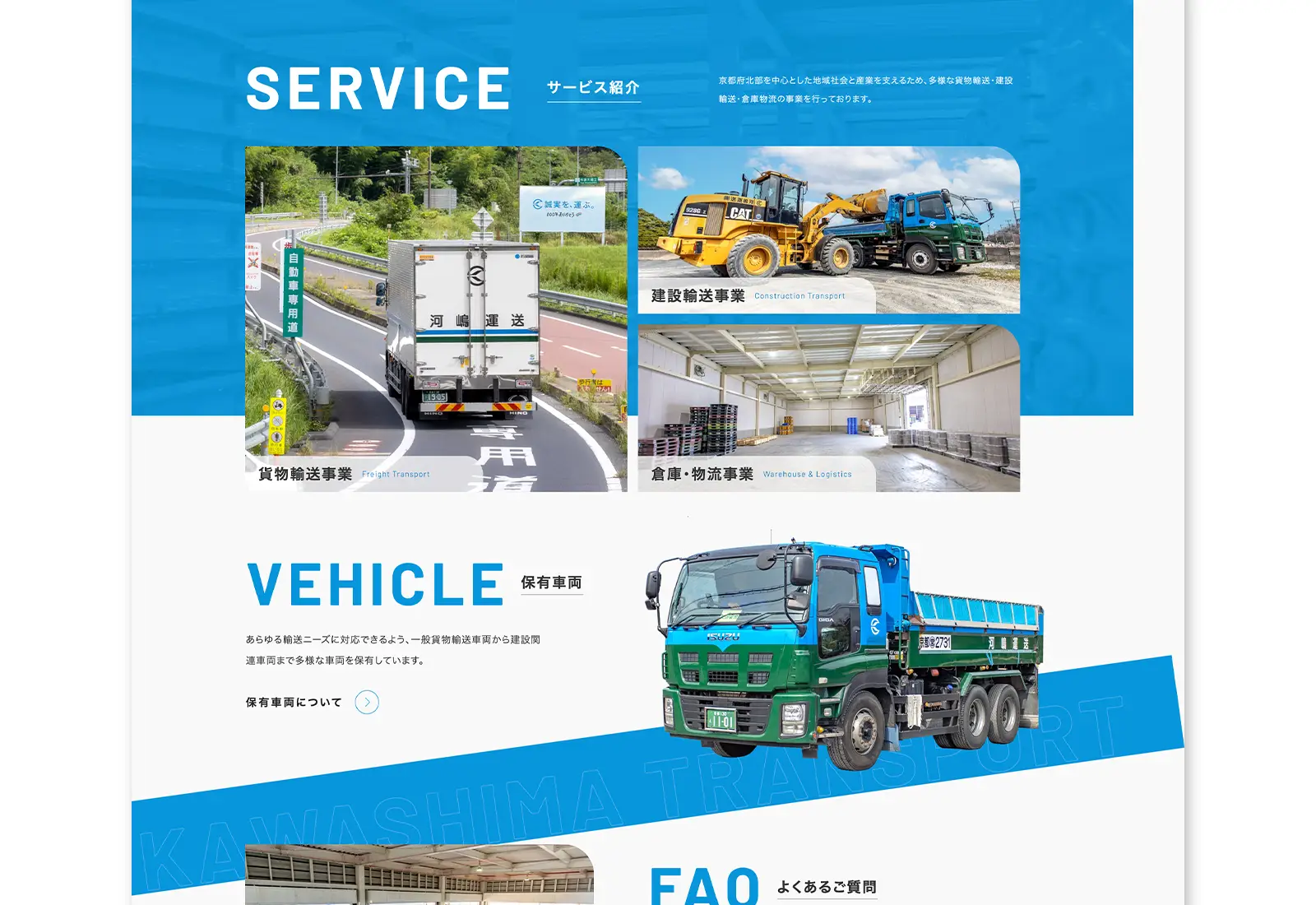 日本三景・天橋立を望む京都府宮津市。昭和2年(1927年)の創業から100余年、京都府北部を中心に物流のインフラを支え続けてこられた河嶋運送株式会社様のコーポレートサイト制作事例です。多くのヒアリングを重ね、「人を大切にする」を体現されている企業姿勢に私たちも感銘を受ける中で、「誠実を、運ぶ。」という言葉で河嶋運送様のアイデンティティとして提案させていただきました。