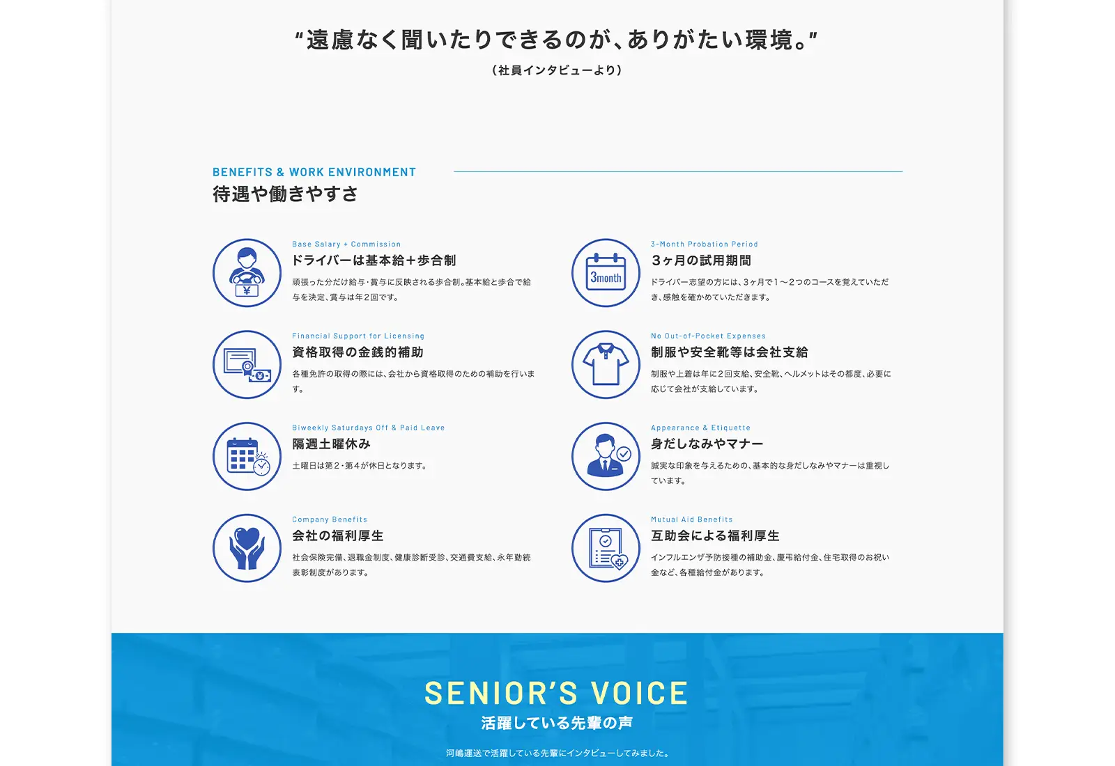 私たちが着目したのは、数値化できない「社風のよさ」でした。ドライバー一人ひとりが「誠実」を体現し、互いを思いやる。その温かな文化が、結果としてお客様からの信頼へと繋がっています。 デザイン面では、歴史ある企業の信頼感を損なうことなく、現場に流れる「人の温もり」が感じられるように、同社の飾らない日々を撮影させていただき、掲載しました。