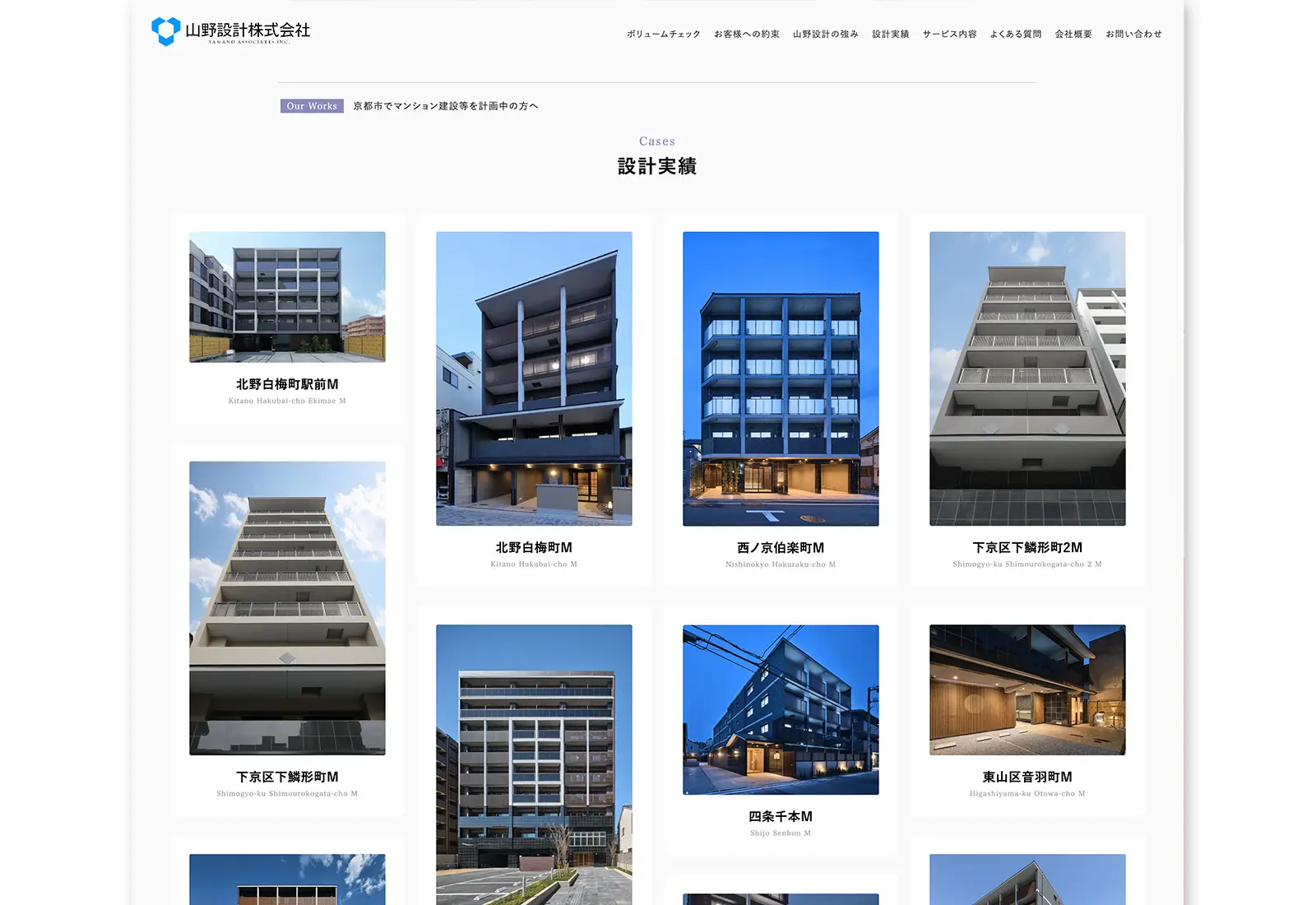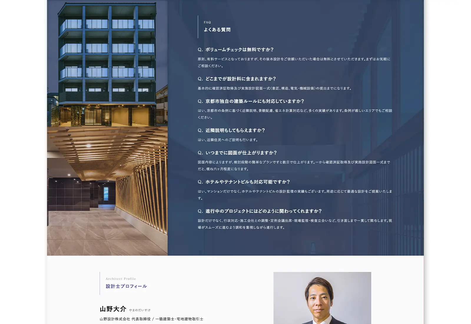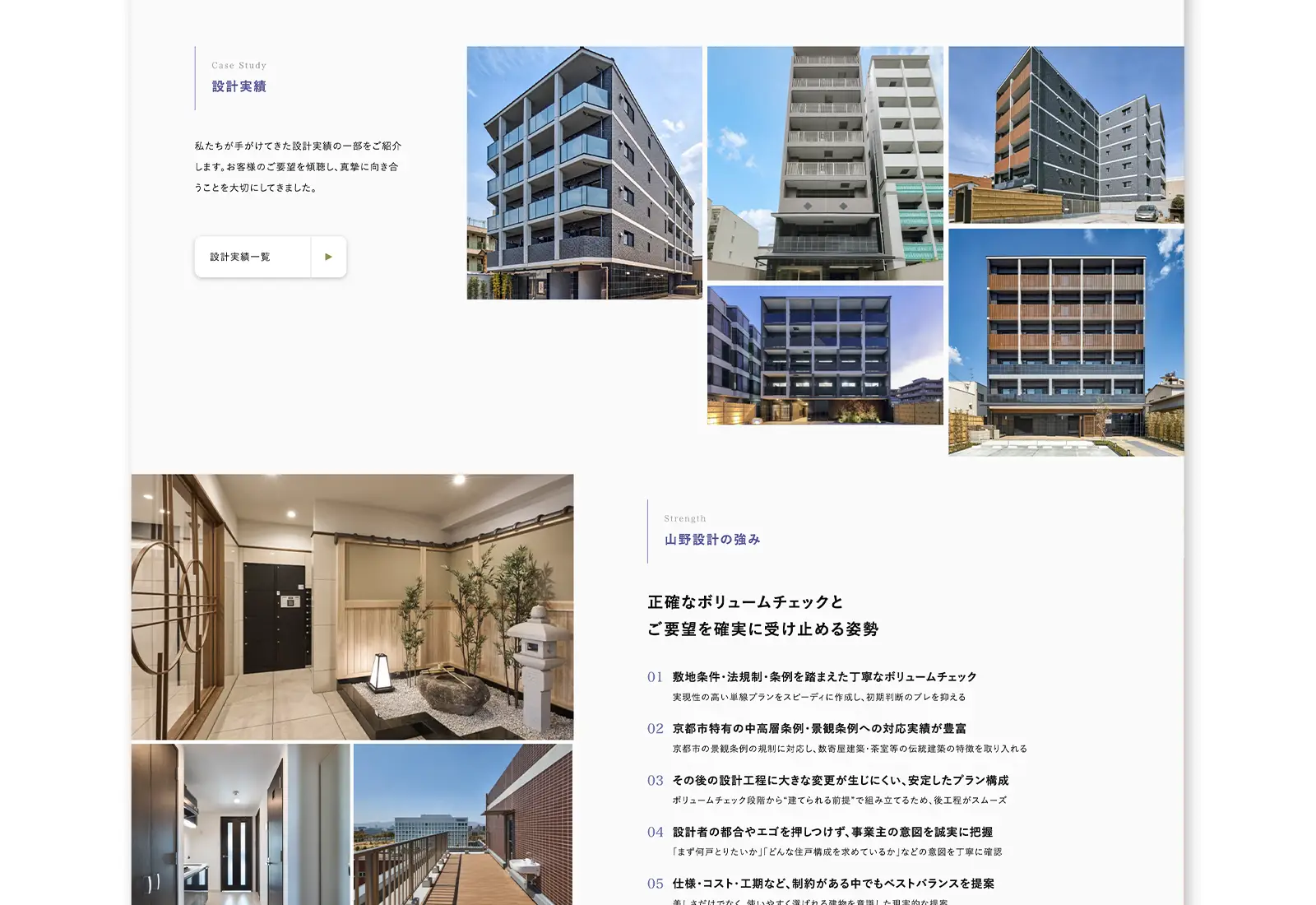 京都を拠点に、マンションやホテルなどの事業用不動産の設計・監理を手掛ける「山野設計株式会社」様の公式サイト制作事例です。設計者のエゴを押し付けず、事業主の収益最大化を前提とした「ボリュームチェック」と、京都の景観条例に対応しながら付加価値を高める「意匠設計」のバランスを重視した経営をされているのが特徴です。専門性の高い設計事務所の信頼感を高めつつ、依頼主が安心して相談できる温かみのあるパートナーとしての姿勢を表現しました。
